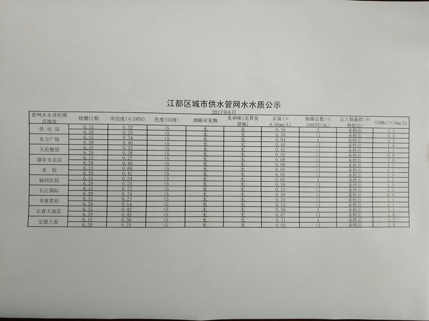 2017年6月江都區城市供水管網水水質公示