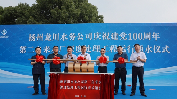 6月29日上午,在喜迎中國共產黨百年華誕之際,揚州龍川水務公司在第二自來水廠隆重舉行深度處理工程運行通水儀式。江都區副區長楊曉榮、發改委副主任王安國、住建局副局長高翔宇、水務局副局長高寅峰、衛健委副主任劉俊杰,以及揚州龍川控股集團黨委書記、董事長朱成勇,黨委副書記、總經理高鵬應邀出席活動。龍川控股集團各單位代表、龍川水務全體領導班子成員、中層干部及其下屬各單位三級以上管理人員、全體黨員以及工程建設、施工、監理單位代表170余人參加了運行通水儀式。