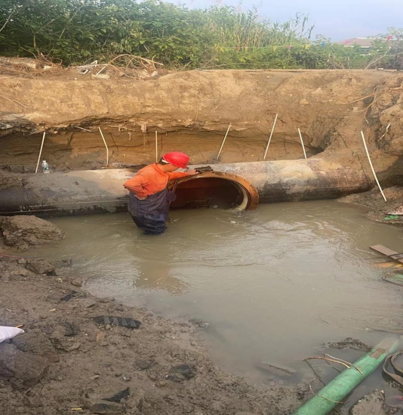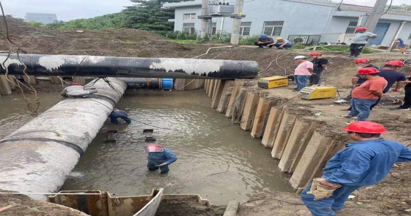 本次施工過程難度大,時間緊,但在揚州龍泉建設工程有限公司韓春暉經理和龍川控股水務建設有限公司管網部張波部長的現場調度和指揮下,現場繁忙而有序,作業人員不懼艱苦。經過長達5小時的辛苦作戰,當日下晚6點完成全部碰接,并于晚上7點提前送水,同時對其管道進行排污沖洗,管道試壓。