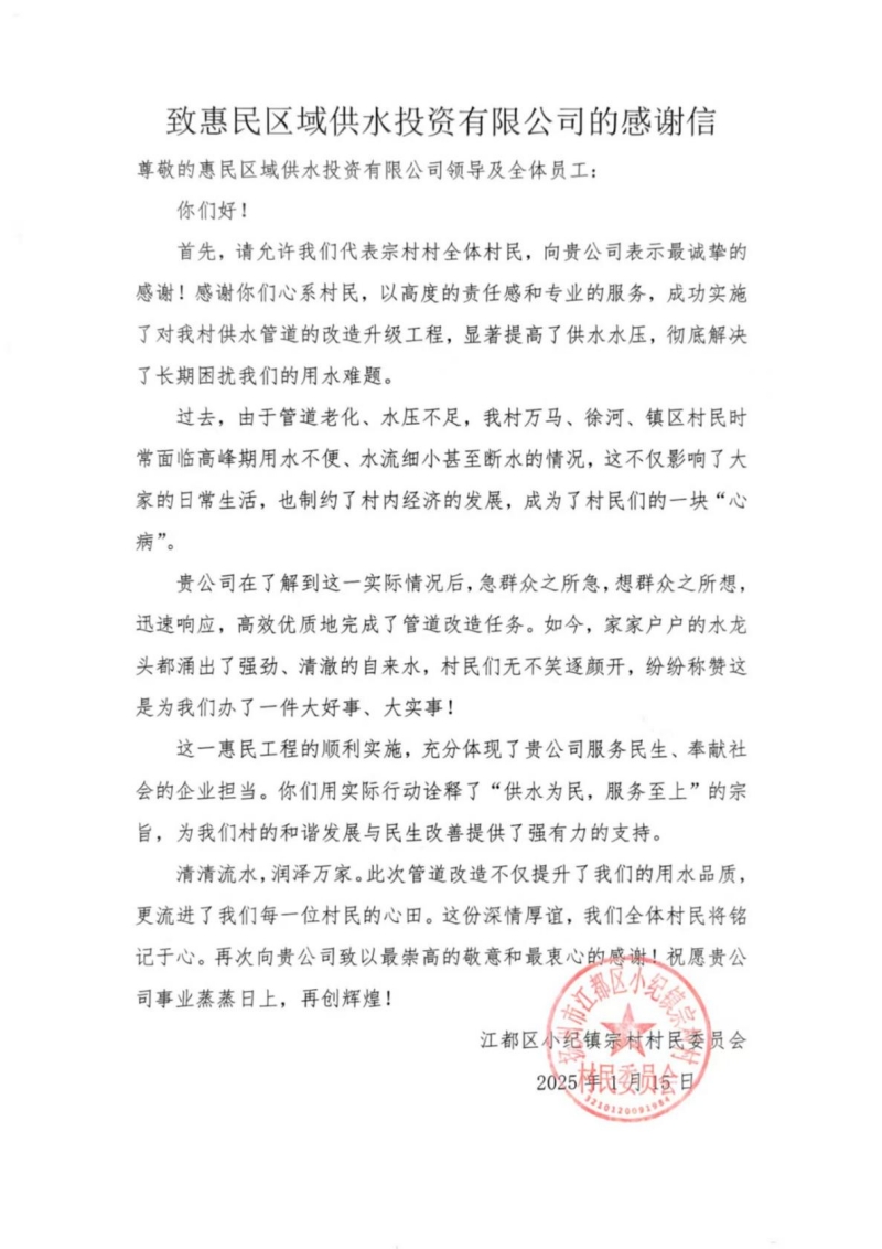 小紀供水管理所收到了一封飽含感激之情的感謝信是這樣說的:“貴公司以高度的責任感和專業的服務,成功實施了對我村供水管道的改造升級工程,顯著提高了供水水壓,徹底解決了長期困擾我們的用水難題。”“清清流水,潤澤萬家。此次管道改造不僅提升了我們的用水品質,更流進了我們每一位村民的心田。這份深情厚誼,我們全體村民將銘記于心。”捧著這封感謝信反復讀著、看著,供水人的內心是“激動的”,讓我們深切感受到付出被看見的溫暖,內心充滿了難以言表的激動與自豪。感動之余,內心也是“忐忑的”,我們更深刻地認識到,信中的每一句感謝,都讓我們更加清醒地意識到身上所肩負的使命,責任感在心中愈發堅定與強烈。